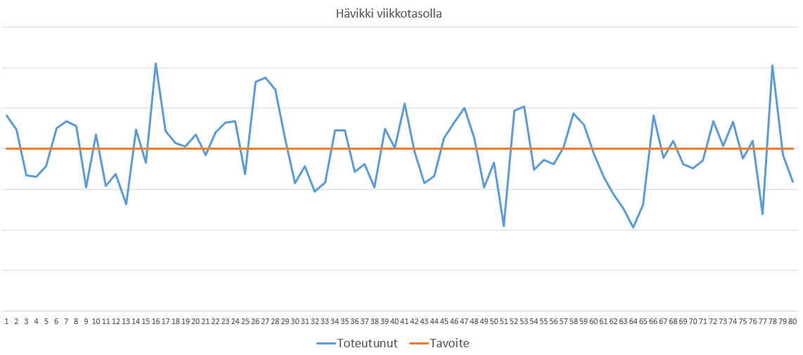 Katsotaanpa ensin tavallista tapaa mitata hävikkiä. Niin kaupoilla kuin osastoillakin saattaa olla jonkinlainen tavoitetaso, johon pyritään. Kun tälle tasolle päästään, esimies kiittelee, että asiat ovat kunnossa. Mikäli ei päästä, tulee raippaa.