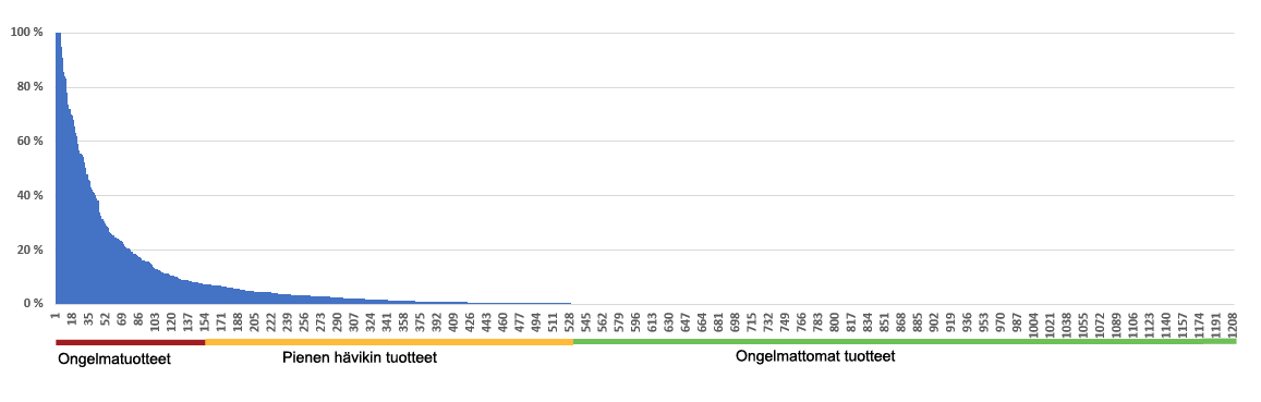 Nyt on hyvin helppoa havaita, että yli puolet tuotteista ei aiheuta mitään ongelmia. Reilu neljännes aiheuttaa vähän, mutta pieni osa aiheuttaa valtavasti ongelmia. Näihin on helppo puuttua, sillä yksittäisissä tuotteissa hävikki on suurta.