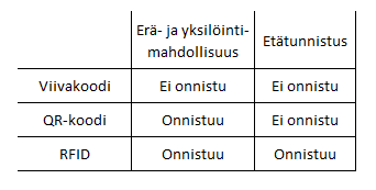 Niin erilaisista tekniikoista kuin onkin kyse, näiden kolmen tunnistusmenetelmän etujen vertailuun riittää kaksi keskeistä päämuuttuja: etätunnistuksen mahdollisuus ja tuotteiden erä- ja yksilöintimahdollisuus. Tunnistusmenetelmät sijoittuvat muuttujien suhteen näin: